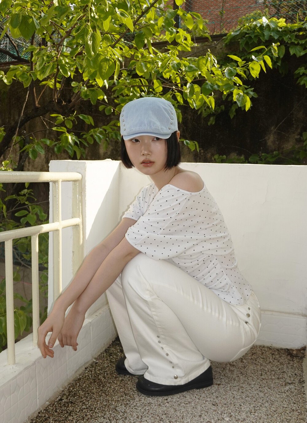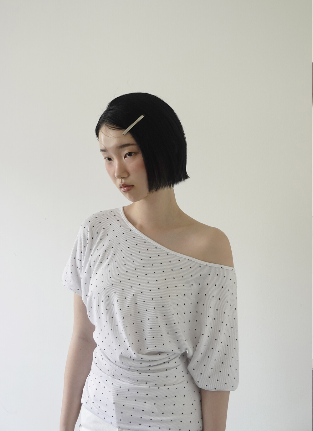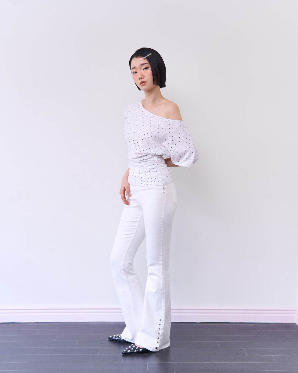 DOT PRINT SHIRRING TOP_WHITE